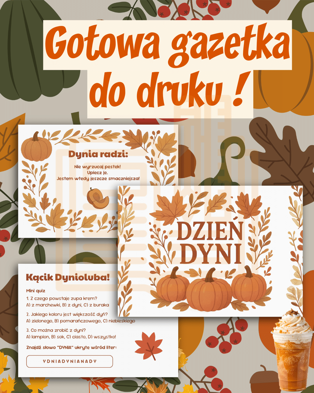 📘 Gazetka ścienna „Dzień Dyni” – kolorowe plansze z ciekawostkami, jesiennymi ilustracjami i dyniowymi poradami, idealne do udekorowania sali lub korytarza szkolnego.