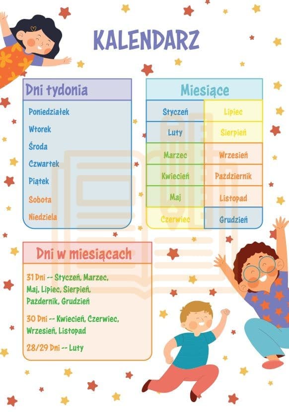 Uczniowie utrwalą dni tygodnia, miesiące oraz liczbę dni w poszczególnych miesiącach . Materiał wspiera orientację w czasie i codzienne funkcjonowanie w rytmie szkolnym.