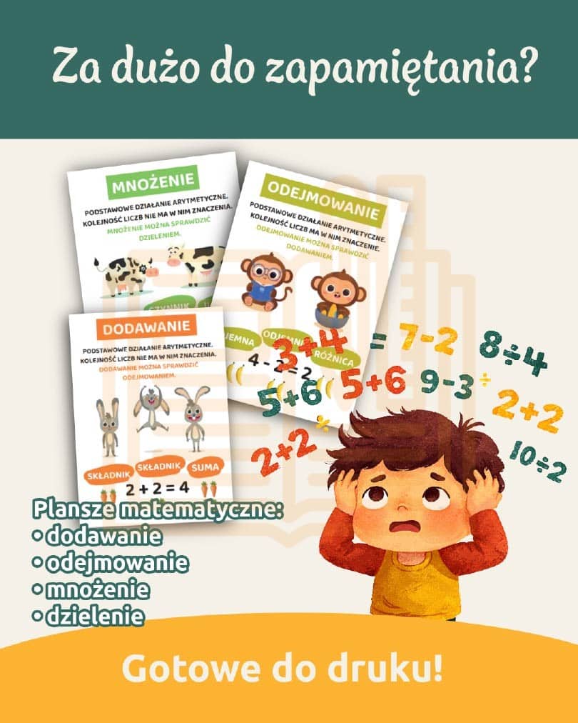 Gazetka „Plansze matematyczne + zegar + kalendarz” to gotowe do druku materiały edukacyjne dla klas 1–3, które wspierają naukę matematyki i orientacji w czasie. W zestawie znajdują się plansze z dodawania, odejmowania, mnożenia i dzielenia wraz z opisem pojęć oraz przykładami. Dodatkowo uczniowie poznają budowę zegara, zależności między godzinami, minutami i sekundami oraz pojęcia takie jak kwadrans i pół godziny. Plansza kalendarza pomaga utrwalić dni tygodnia, miesiące i liczbę dni w miesiącach. Materiały są kolorowe, czytelne i przyjazne dla dzieci, dzięki czemu świetnie sprawdzą się jako gazetka klasowa lub pomoc dydaktyczna. To idealne wsparcie dla nauczycieli edukacji wczesnoszkolnej. Nauka przez zabawę jeszcze nigdy nie była tak prosta!