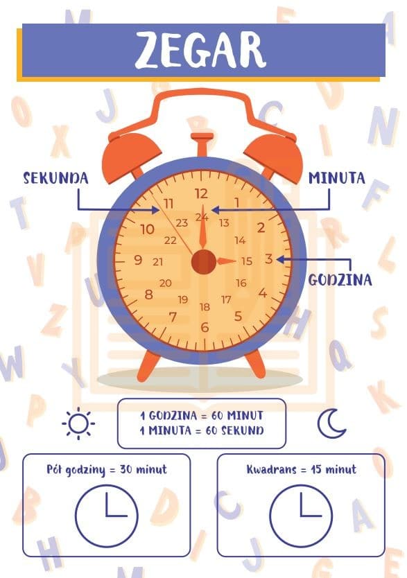 Czytelna grafika zegara pokazuje godziny, minuty i sekundy oraz zależności między nimi (1 godzina = 60 minut, 1 minuta = 60 sekund) . Dodatkowo uczniowie poznają pojęcia takie jak pół godziny i kwadrans.