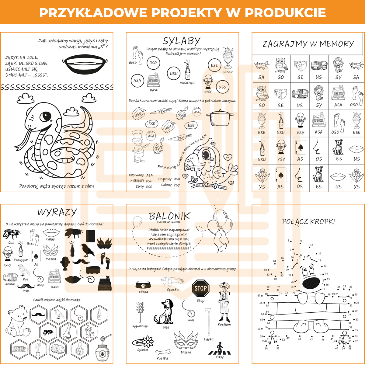 Materiał jest mocno skondensowany – na jednej stronie znajdziesz więcej ćwiczeń niż w większości dostępnych na rynku zestawów. Dzięki temu dziecko ma więcej okazji do powtarzania i utrwalania prawidłowej wymowy w krótszym czasie, a terapeuta zyskuje praktyczne narzędzie do efektywnej pracy.