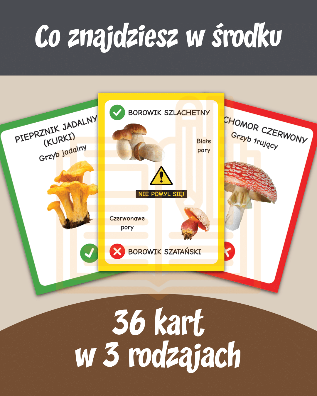 karty typu „Nie pomyl się!” – pokazujące pary podobnych gatunków i wskazujące różnice (np. koźlarz babka i borowik ponury) ⚠️,