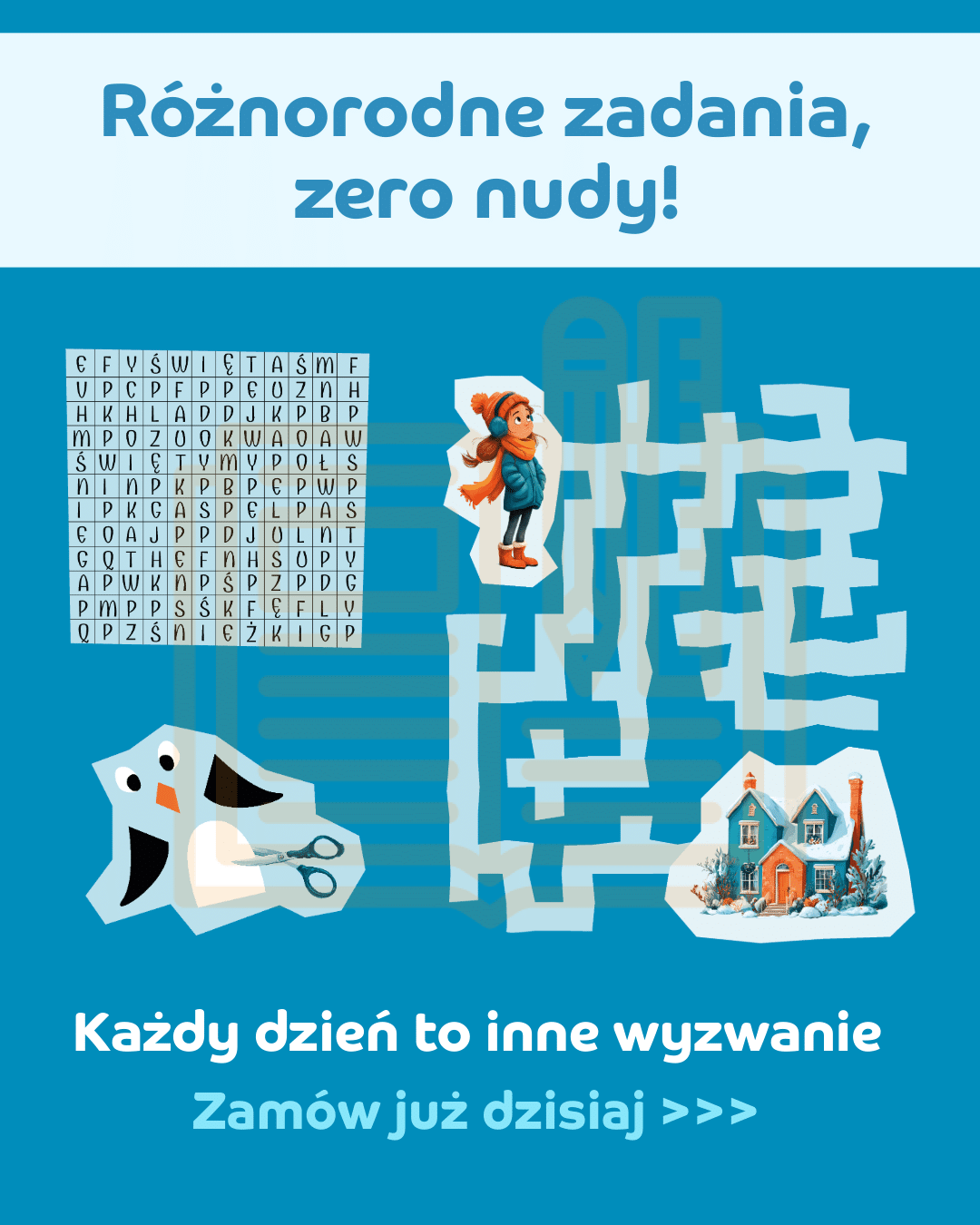 To 24 różnorodne zadania – od rebusów, przez krzyżówki, po zadania artystyczne, ruchowe, logiczne i tekstowe.