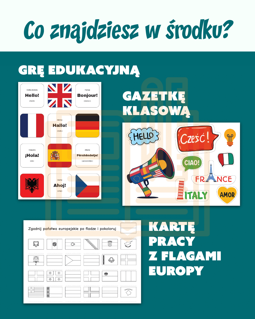 W komplecie znajduje się gazetka klasowa w formacie A4, gra edukacyjna w formacie A4 oraz PDF z wszystkimi flagami Europy do pokolorowania.