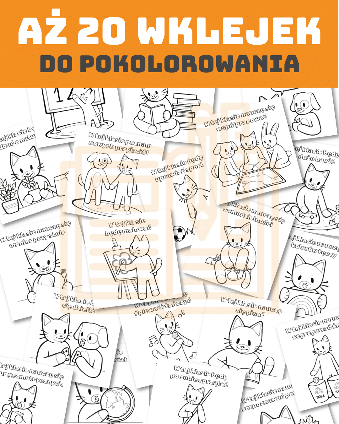 Praktyczny zestaw 20 stron PDF w formacie A4. Każda strona zawiera kolorowe wklejki z hasłami i ilustracjami, które wspierają budowanie dobrych relacji i pozytywnej atmosfery w klasie pierwszej.