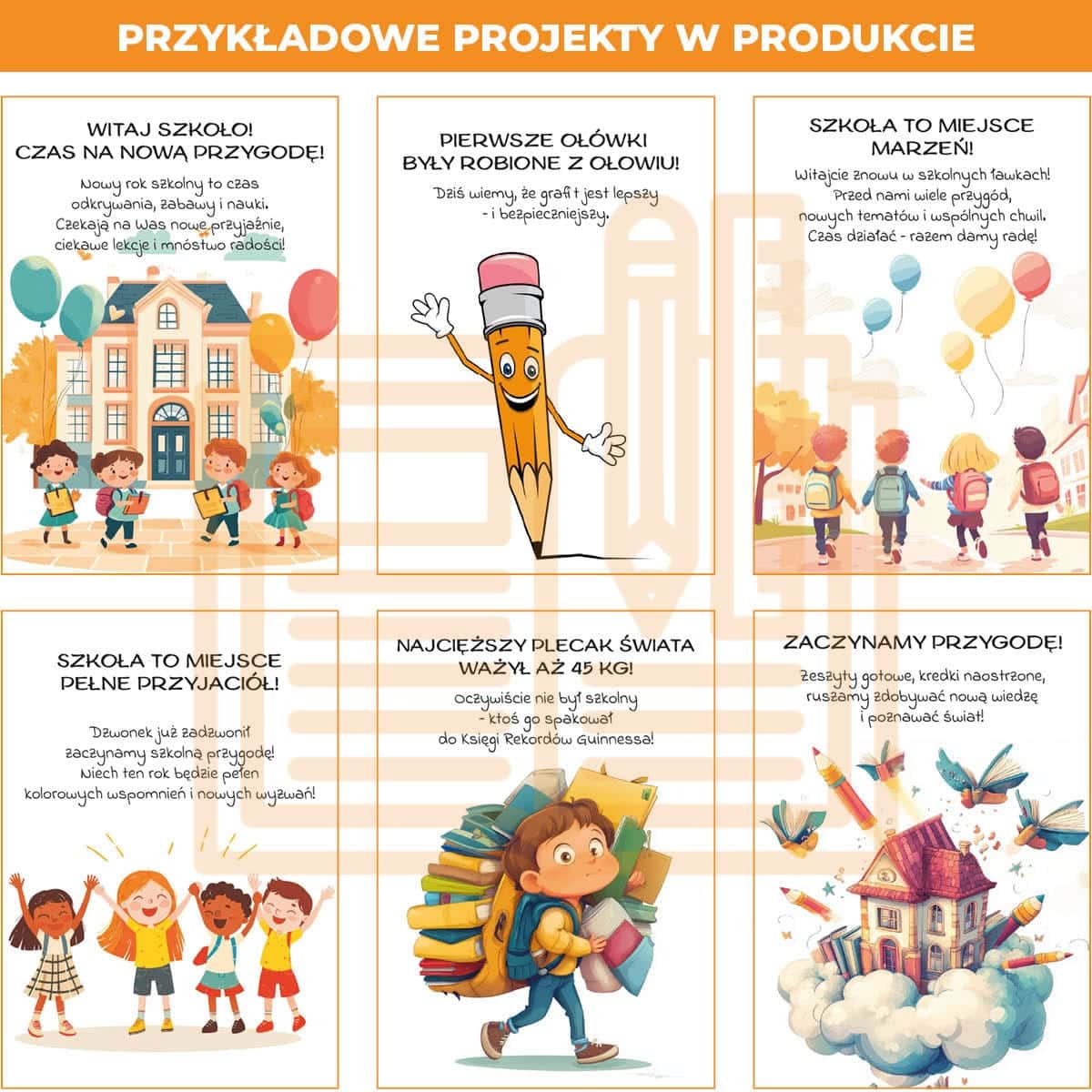 ✔️ Kolorowe grafiki i plansze – przedstawiające dzieci, szkolne przybory, plecaki i inne elementy kojarzące się z początkiem roku