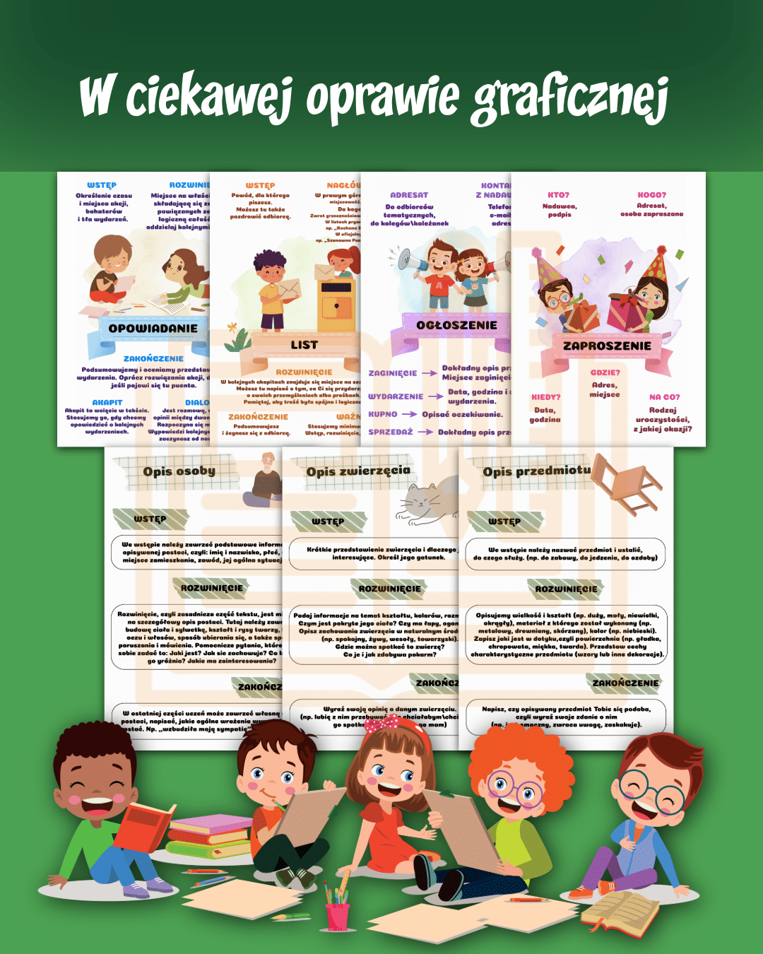 Gotowy zestaw PDF z przykładami listu ✉️, opowiadania 📖, zaproszenia 🎉, ogłoszenia 📚 oraz opisów: osoby 👧, zwierzęcia 🐾 i przedmiotu 🪑.