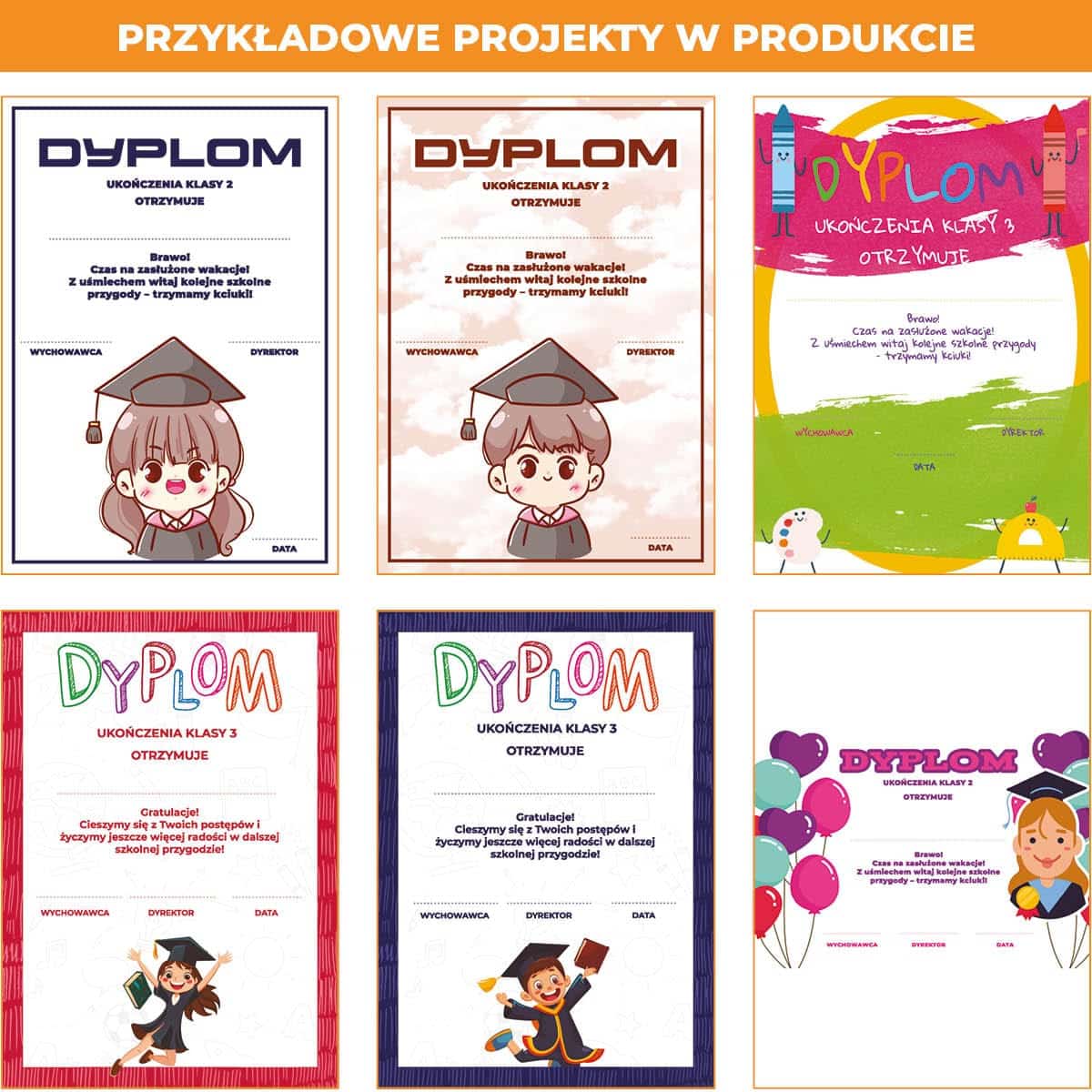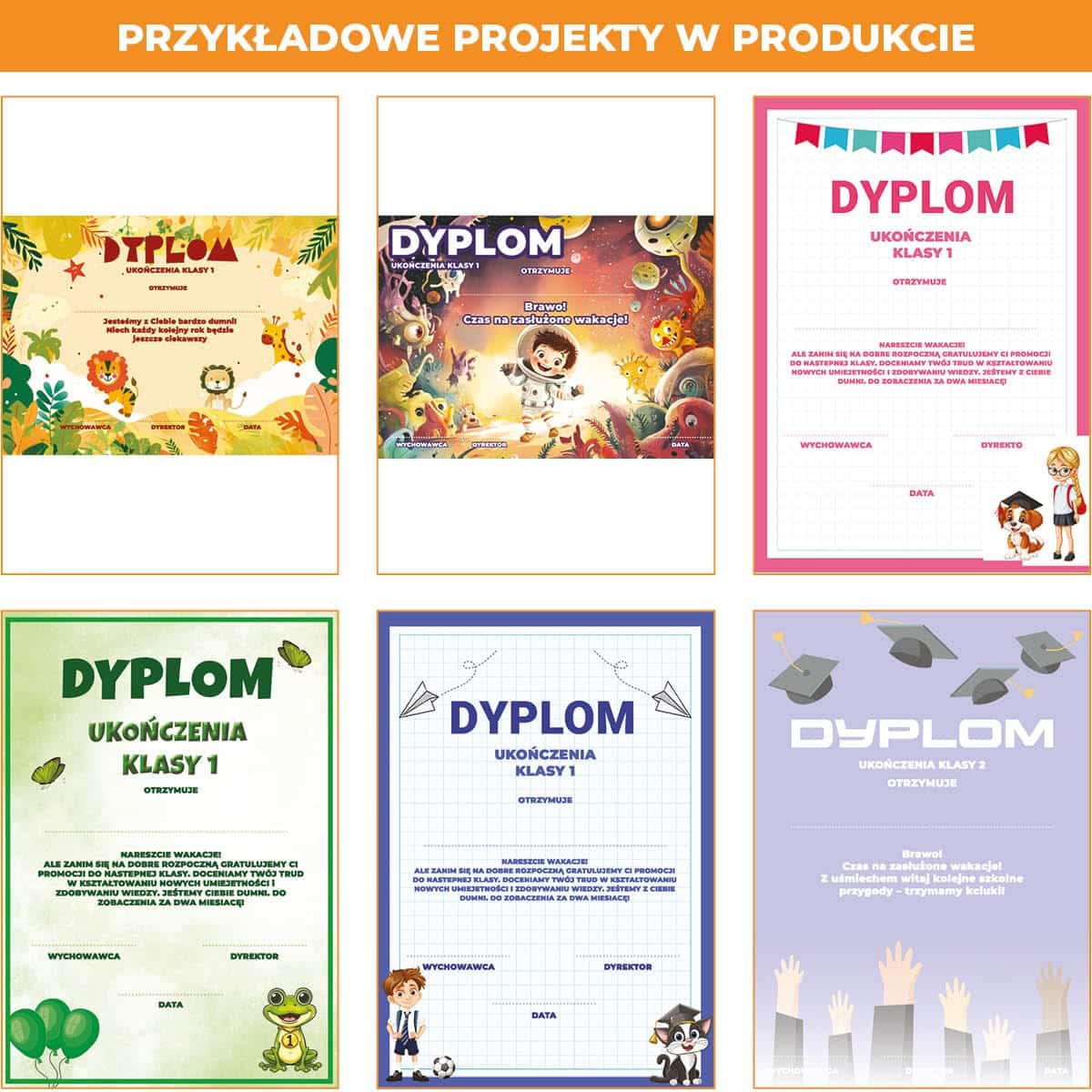 ✔️ Dyplomy ukończenia klasy 1, klasy 2 i klasy 3 – trzy odrębne wersje z dedykowanym tekstem