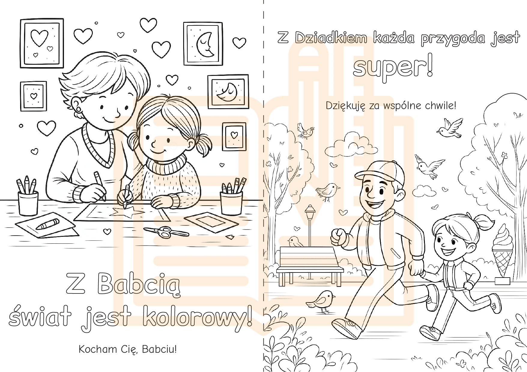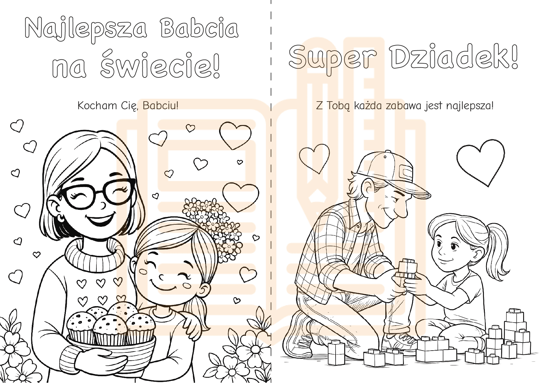 ✔ Laurki do kolorowania i uzupełniania – z hasłami typu: „Najlepsza Babcia na świecie”, „Super Dziadek”, „Kocham Was”